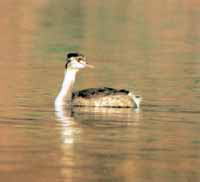 冬鳥として渡来しますが、多摩川で見るのはまれです。全長56センチ。頭に冠羽(かんう)があり、首が長く、ピンク色のとがったくちばしを持つ、大型の水鳥です。冬羽は頬から首にかけて白く、夏羽は頬のうしろが赤い飾り羽になります。潜水して魚を捕食します。