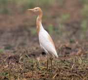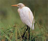 春の渡りの時期に多摩川などで見ることがあります。全長50センチ。コサギに似ていますが、少し小さく、くちばしもやや短くて黄色です。冬羽は全身白く、夏羽は頭から胸にかけてオレンジ色に変わります。水田や草の中でバッタやカエルなどを捕食します。(写真右:夏羽)