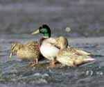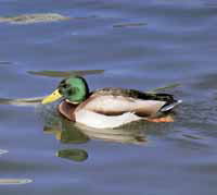 10月〜4月頃、冬の季節多摩川に渡来しますが、数は多くありません。全長59センチ。オスは頭が光沢のある深緑色で、首に白い輪があり、くちばしが黄色です。上尾筒(じょうびとう・尾の付根の部分)が黒く、先端が上にカールしています。アヒルの原種で、飼育したマガモを品種改良してアヒルができました。(写真右:オス)