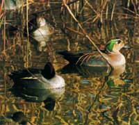 コガモよりやや大きく、習性もコガモに似ていますが、多摩川での観察はまれです。全長40センチ。オスの顔に緑とうすい黄色の巴形(ともえがた)の模様があるとことから、この名が付いたといわれています。(右:オス、左:コガモ)