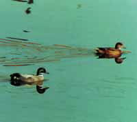 多摩川では他のカモ類に混じって、まれに観察されることがあります。全長48センチ。オスは頭がナポレオン帽子のような形で、目の後ろが金属光沢の濃い緑色です。また三列風切が伸びて、飾り羽になって尾に垂れ下がっています。(左:オス、右:メス)