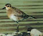 春秋の渡りの季節に、多摩川でしばしば観察されます。全長24センチ。ムクドリと同じ大きさです。夏羽はその名のように、のどから腹にかけて黒い模様が目立ち、それを縁どるように額から首、腹の脇にかけて白い帯があります。冬羽と幼鳥は全体が黄褐色です。(写真右:冬夏中間羽)