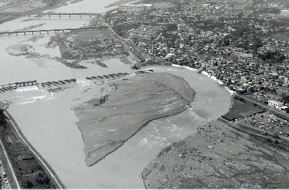 午後9時45分、必死の水防活動もむなしく、本堤防が長さ5メートルにわたり決壊。堤防を洗う濁流の勢いはとどまるところをしらなかった。家屋の危機を知り自宅へ貴重品を取りに戻ろうとする被災者と警備に当たる機動隊の間で衝突が起きることもあった。