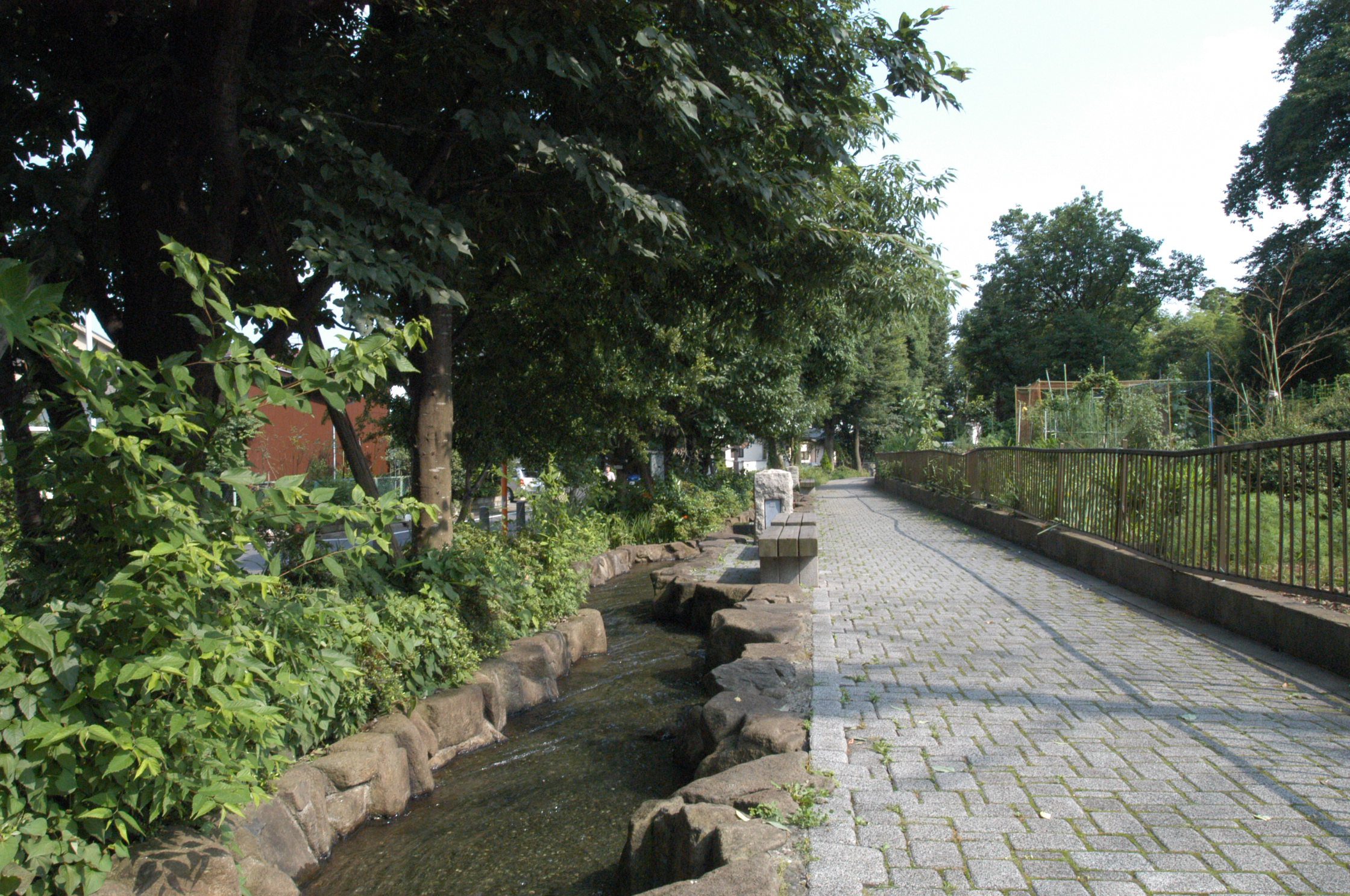 長さ約100メートルの人工の流れで、かつての野川から水を引いた用水路の面影を伝えるために造られました。かつては「水車堀」と呼ばれていました。昭和の初めまで水車があり、日がな一日コットンコットンと廻りながら米をつき、粉をひいていました。現在では下流に約290メートルの緑道が整備され、ツツジなどが植えられています。 |