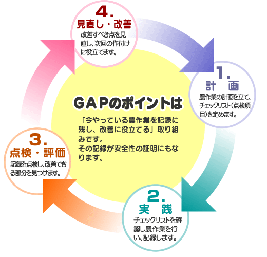 農作業の各工程において、安心・安全な農産物を生産するために確認するべき項目を事前に設定した上で、正確な実施、記録、点検及び評価を行い、リスクを低減する適切な管理を実施することにより、農産物の安全性をより向上させ、それをPDCAサイクル(Plan〔計画〕→ Do〔実行〕→ Check〔評価〕→ Act〔改善〕)によって持続的に改善をしていく仕組みです。
