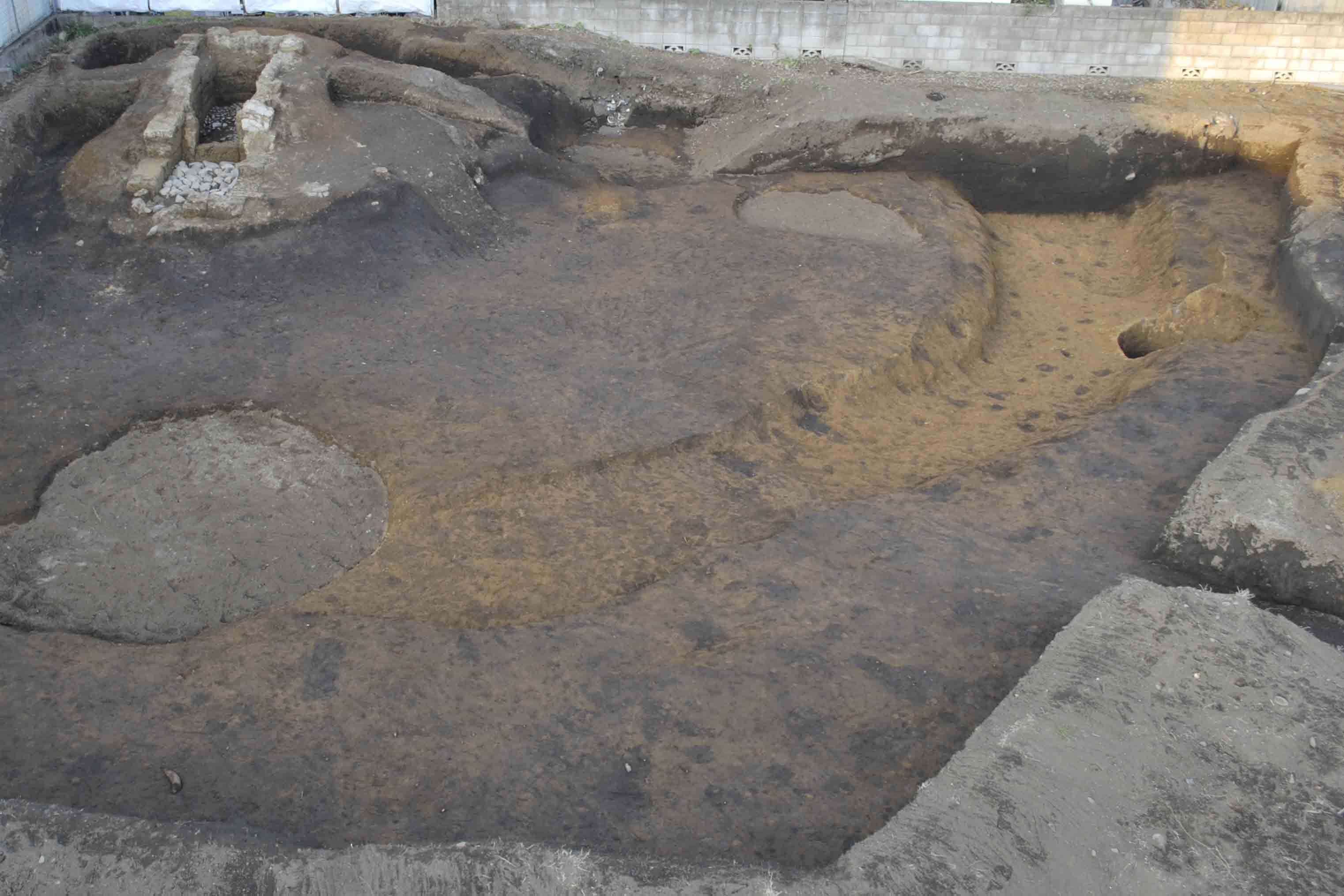 平成23年、猪方三丁目の宅地造成にともなう発掘調査で、猪方小川塚古墳の横穴式石室(よこあなしきせきしつ)が発見されました。調査前の段階で、墳丘はほとんど削られており、古墳の端の一部だけが残っているものと想定されました。ところが、発掘調査を行うと、市内ではまだ確認されていなかった横穴式石室が発見されました。 |
