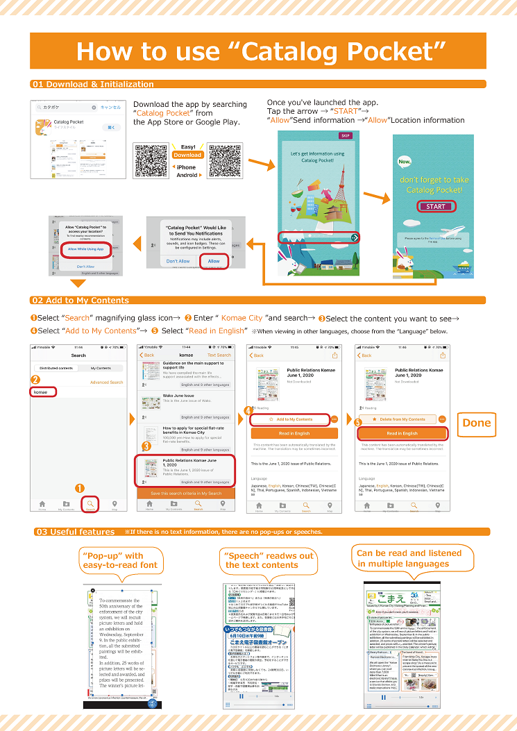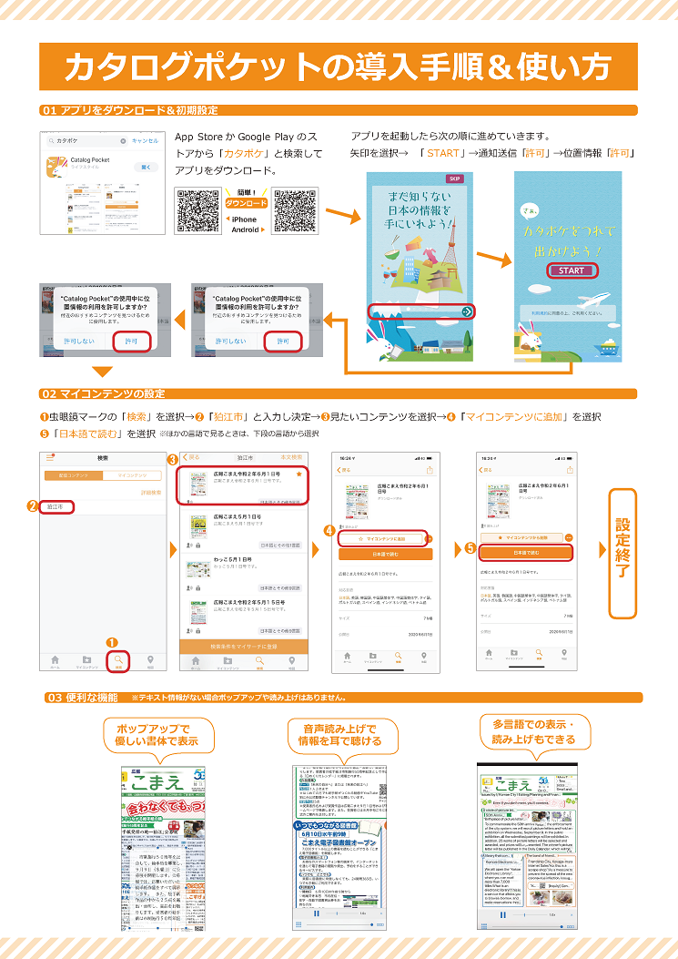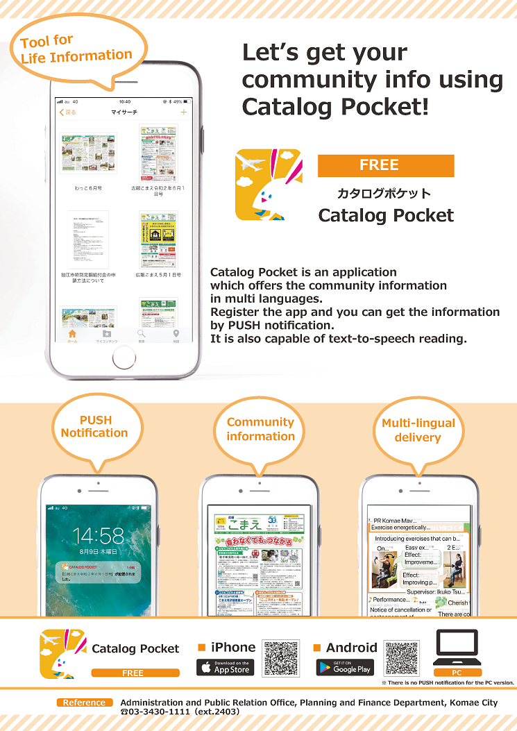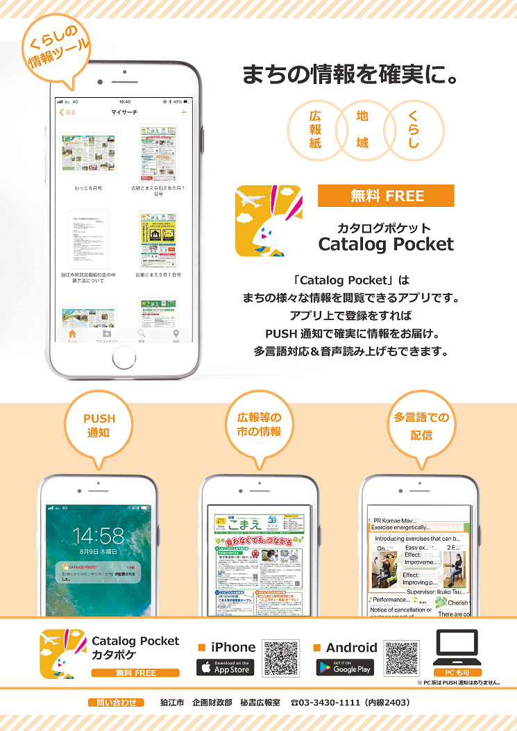 無料アプリ「カタログポケット」をダウンロードして登録すると、お持ちのスマートフォンやタブレット端末機で手軽に広報こまえ等の市の情報を閲覧することができます。