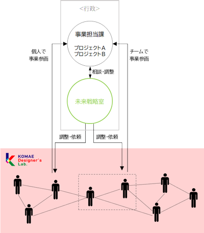 市の取組みに参画するまでの流れとしては、事業担当課から こまえのデザイン. に相談があったタイミングで、その案件に合わせて個別にデザイナーさんに声掛けをして、事業担当課との打ち合わせで条件を詰めたうえで、正式に依頼する流れとなります。