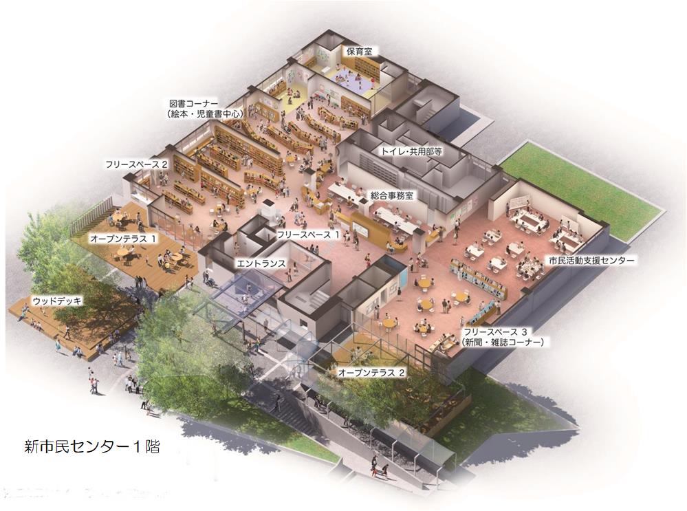 現在の市民センターは令和6年9月から改修工事が始まり、令和7年11月ごろに「公民館」、「絵本・児童書中心の図書コーナー」、「市民活動支援センター(こまえくぼ1234)」の3つの機能を備えた新たな複合施設として、リニューアルオープンをする予定です。