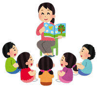 図書コーナーのお話コーナーで読み聞かせ、保育室に子どもを預けて公民館事業に参加、市民活動支援センターでボランティア活動、 ウッドデッキでティータイムなど