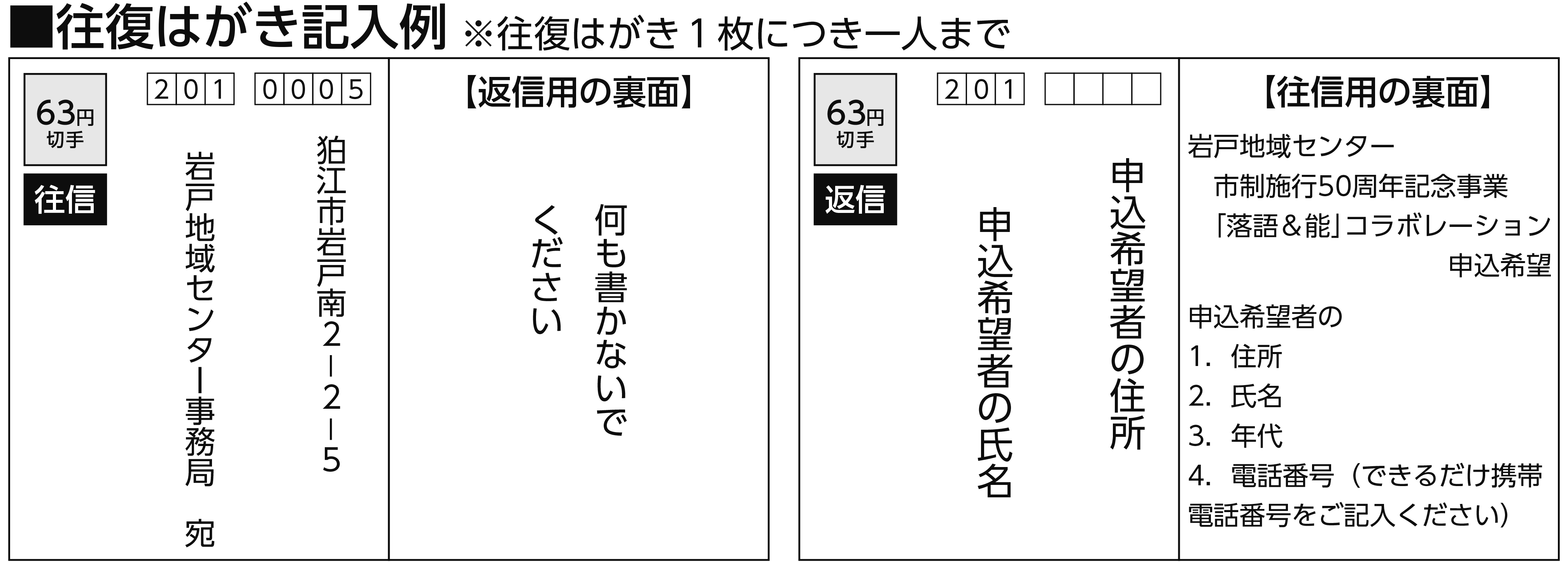 ※多数抽選 〔出演〕柳家さん喬さん(落語)、中村昌弘さん(能楽) 〔会場・申し込み・問い合わせ〕8月20日(木曜日)(必着)までに、来場観覧は往復はがき(応募は一人1回まで。記入例参照。結果は8月28日(金曜日)までに返信はがきでお知らせ)で、オンライン視聴は専用フォーム(下記二次元コードから申し込み)で岩戸地域センター 電話(3488)7040へ。