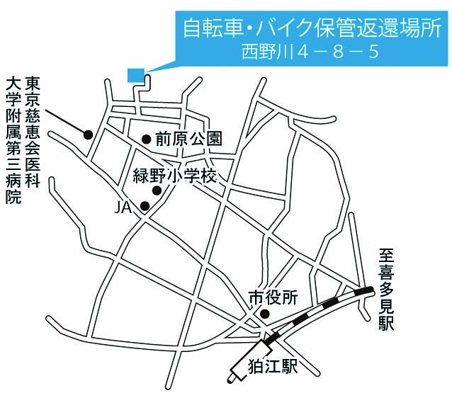 撤去自転車等保管返還所(図4参照)で60日間保管します。自転車・バイクを引き取るには、返還手数料(自転車1台3,000円、バイク1台5,000円)と鍵をお持ちください。