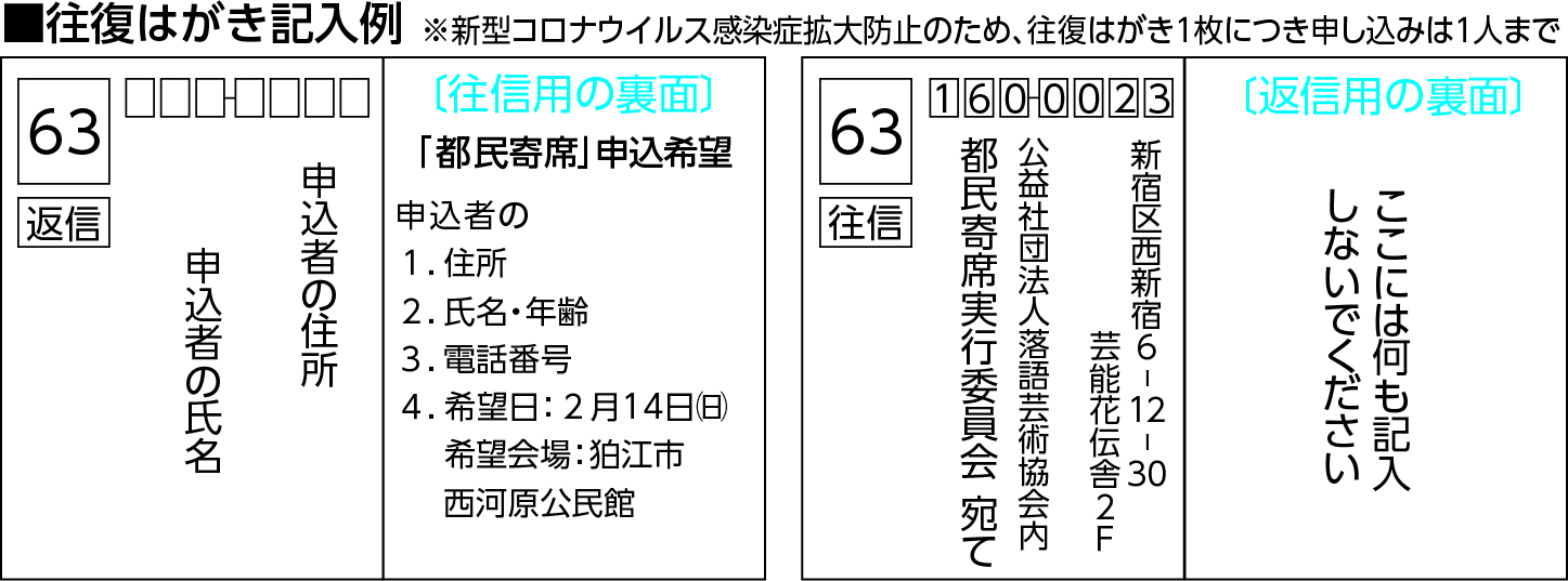 〔申し込み・問い合わせ〕令和3年1月8日(金曜日)(消印有効)までに、往復はがき(記入例参照・1枚1会場のみ有効・未就学児不可)を都民寄席実行委員会 電話(5909)3081へ。