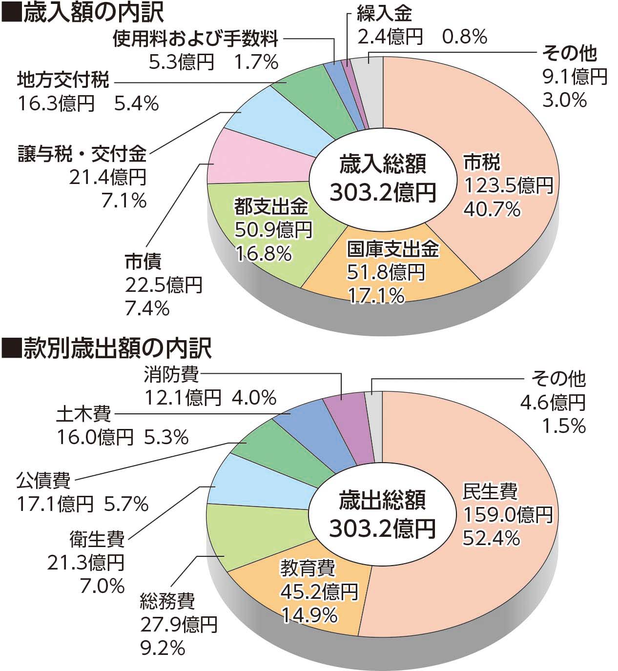 予算規模は、一般会計の予算額で見ると、303億2,000万円で前年度比3億9,100万円(1.3%)の増額となっています。