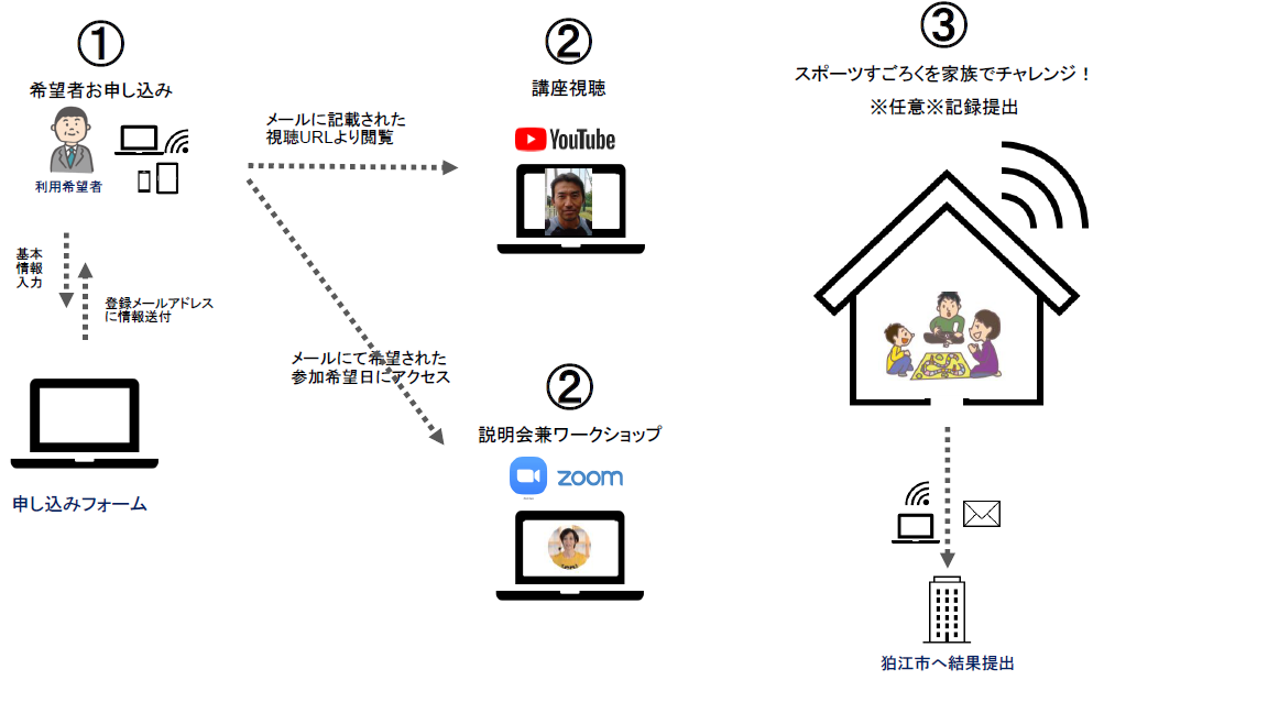 (2)の終了後にスポーツすごろくを自宅で実施し、実施記録を市に提出します。参加者には、後日、市役所でスポーツドリンク等のセットをプレゼント(大塚製薬株式会社協賛)します。