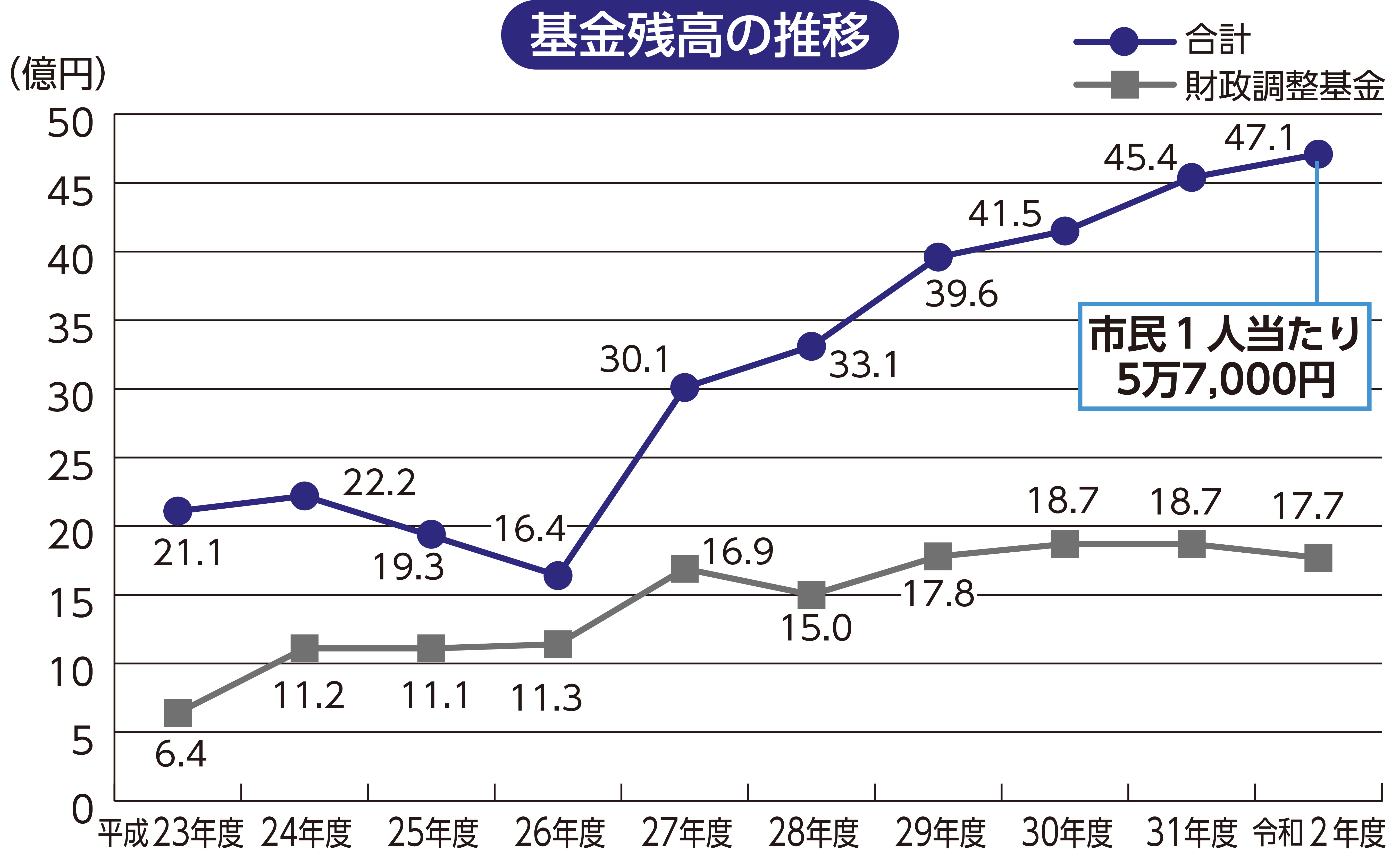 基金残高は一時に比べると増加しているものの、他団体と比較すると少なく、今後も見込まれる社会保障費の増加や公共施設の更新に備え、引き続き積み増ししていく必要があります。