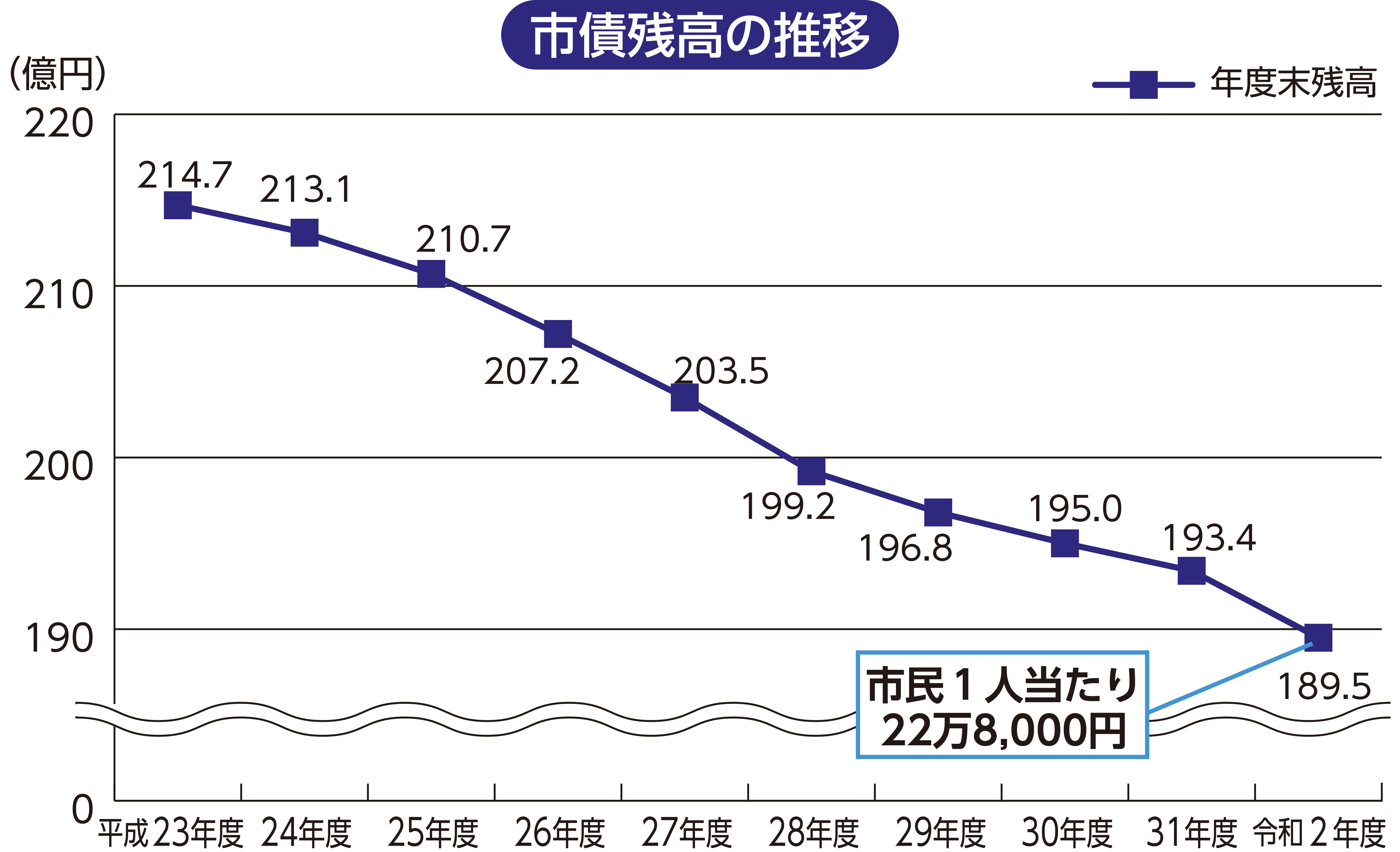 財政構造の弾力性を示す経常収支比率は、小学校給食調理業務などの増があるものの、幼児教育・保育の無償化の通年化などにより経常経費充当一般財源が減少し、地方消費税交付金などの税連動交付金や普通交付税の増などによる経常一般財源総額が増えたことにより改善しました。また、市債残高を減らし、基金残高を増やすことで、将来負担の抑制に努めることができました。
