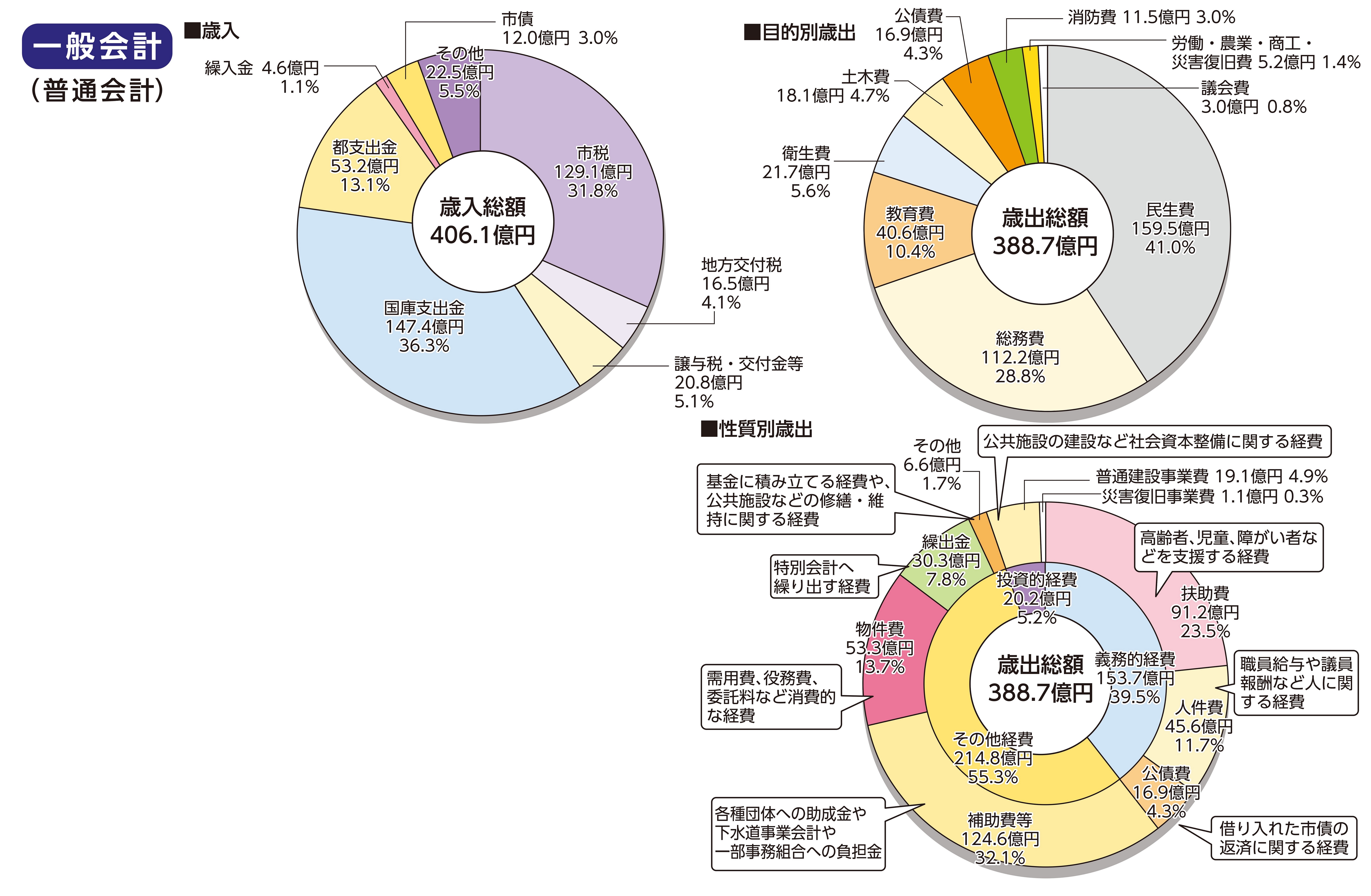 | 一般会計 | 406億3,190万円 | 388億9,936万6千円 | 17億3,253万4千円 | |