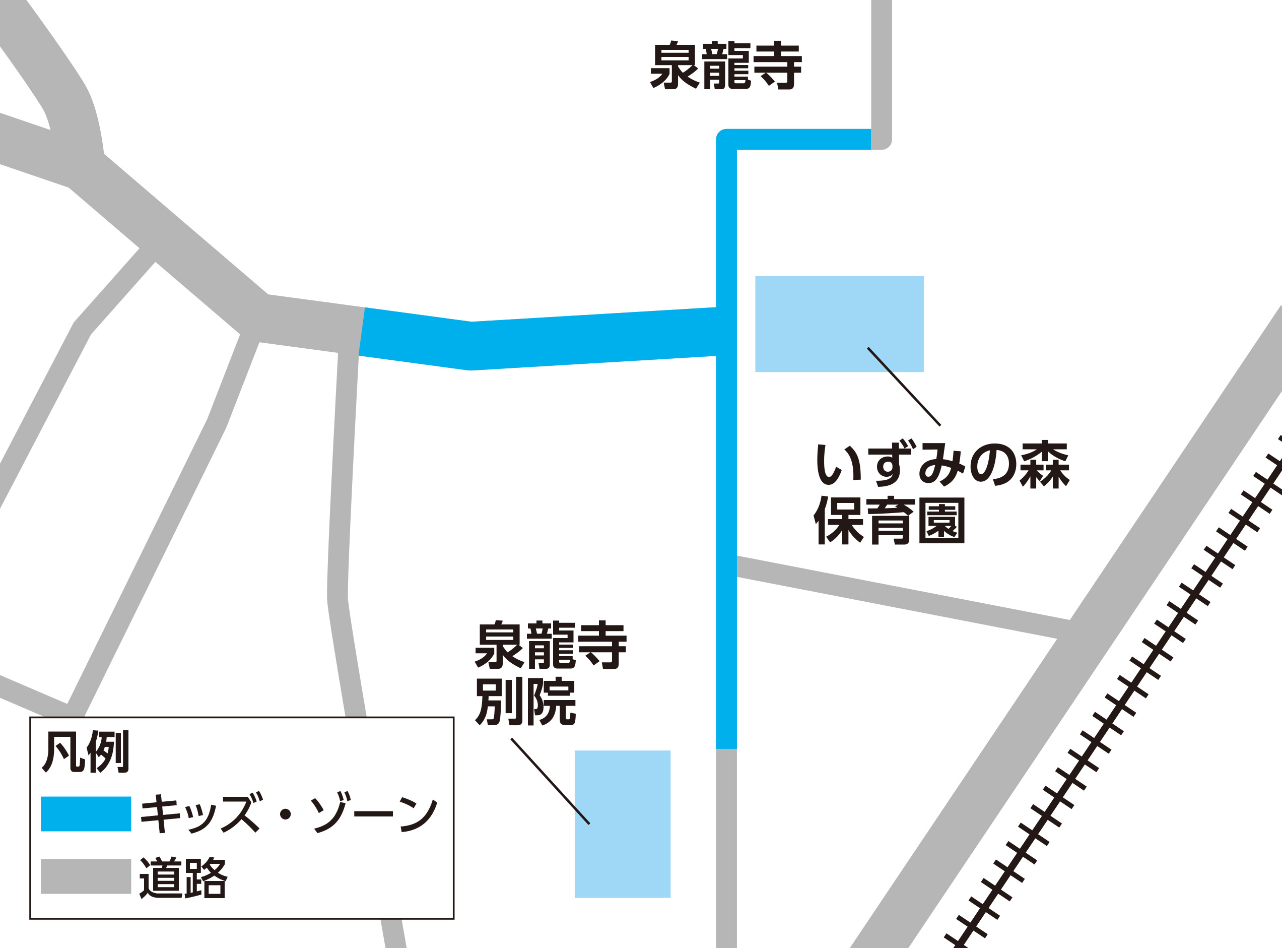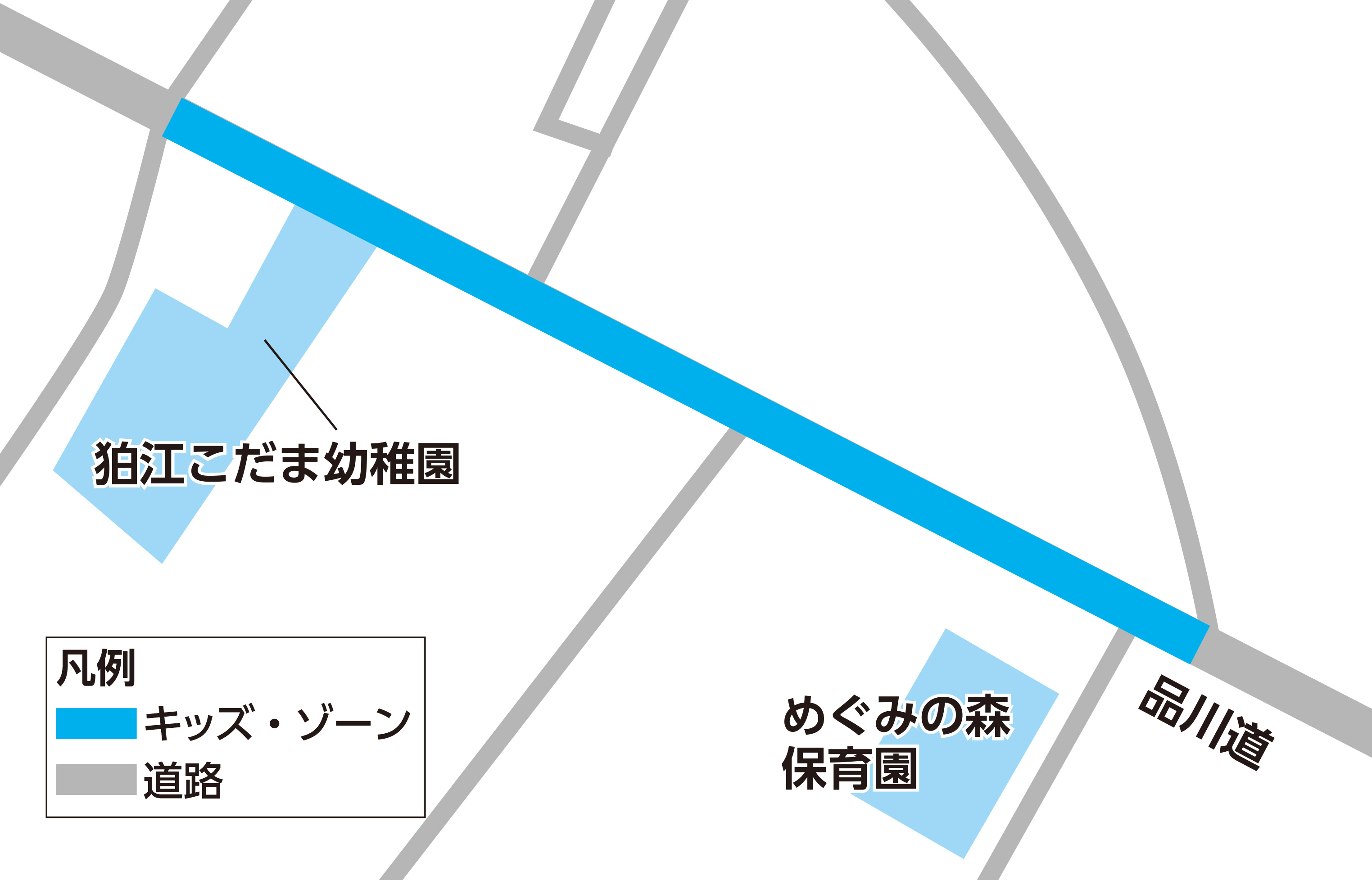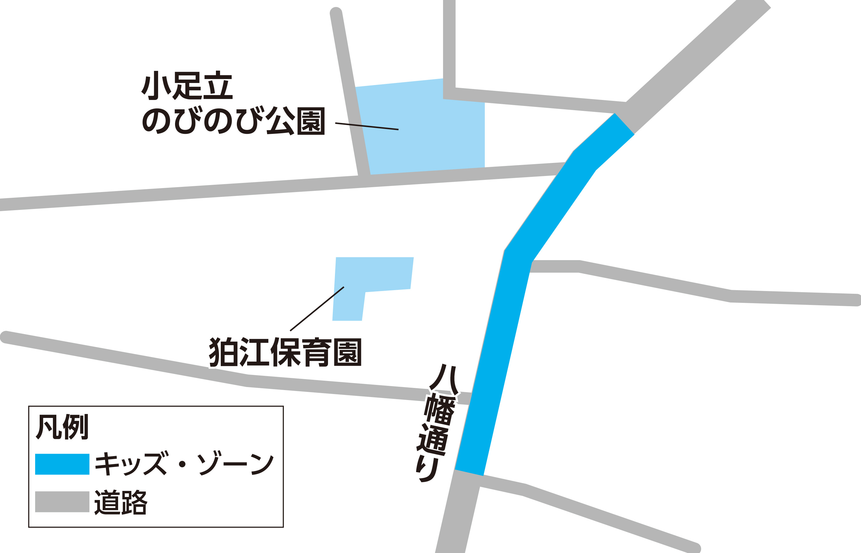保育園児の散歩等が行われていることを認識し、安全を心掛けるようお願いします。キッズ・ゾーンの設定箇所は、各図を参照してください。