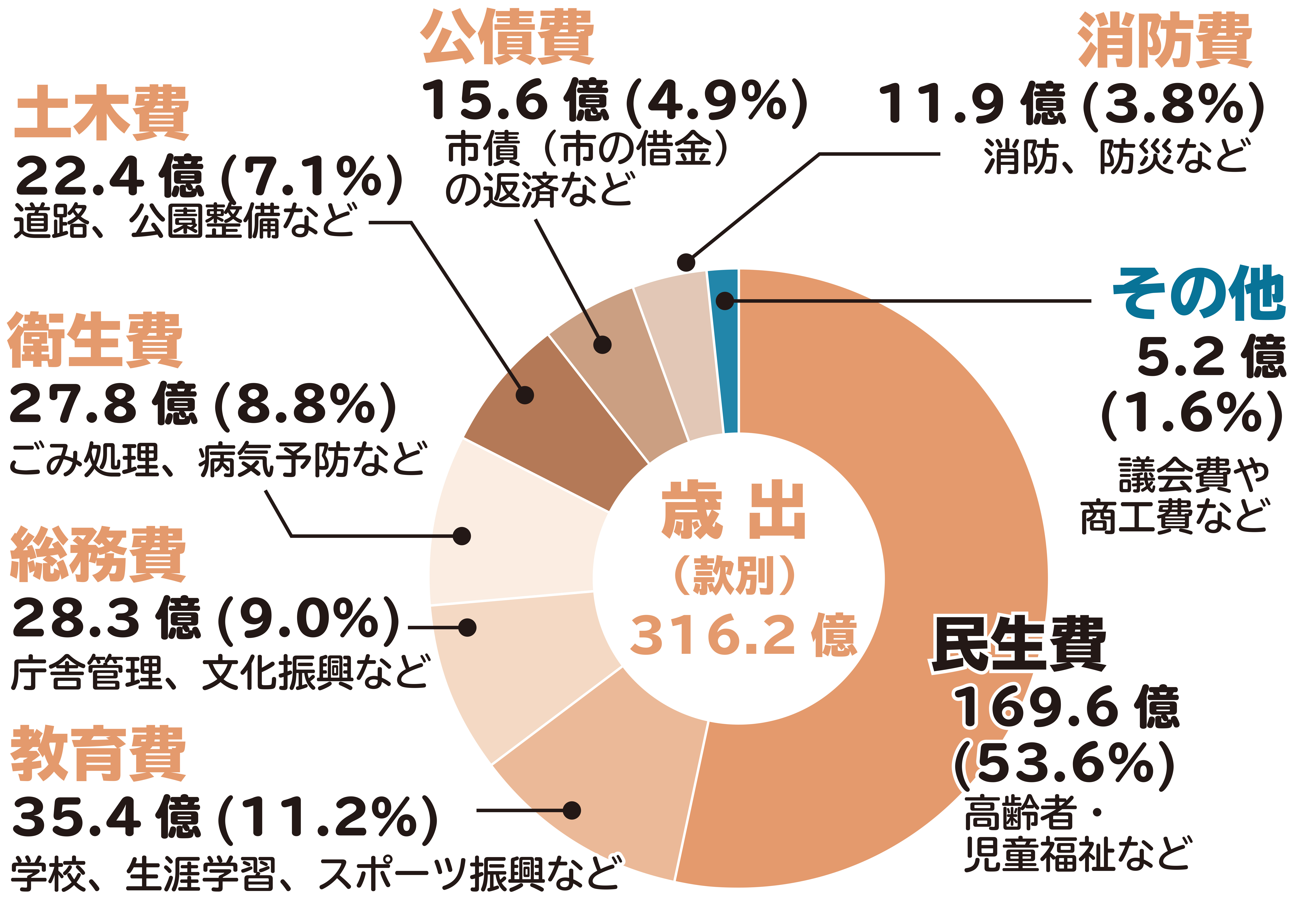 一般会計予算額316億2,000万円を市民1人あたりに換算すると、予算額は38万2,000円になります。