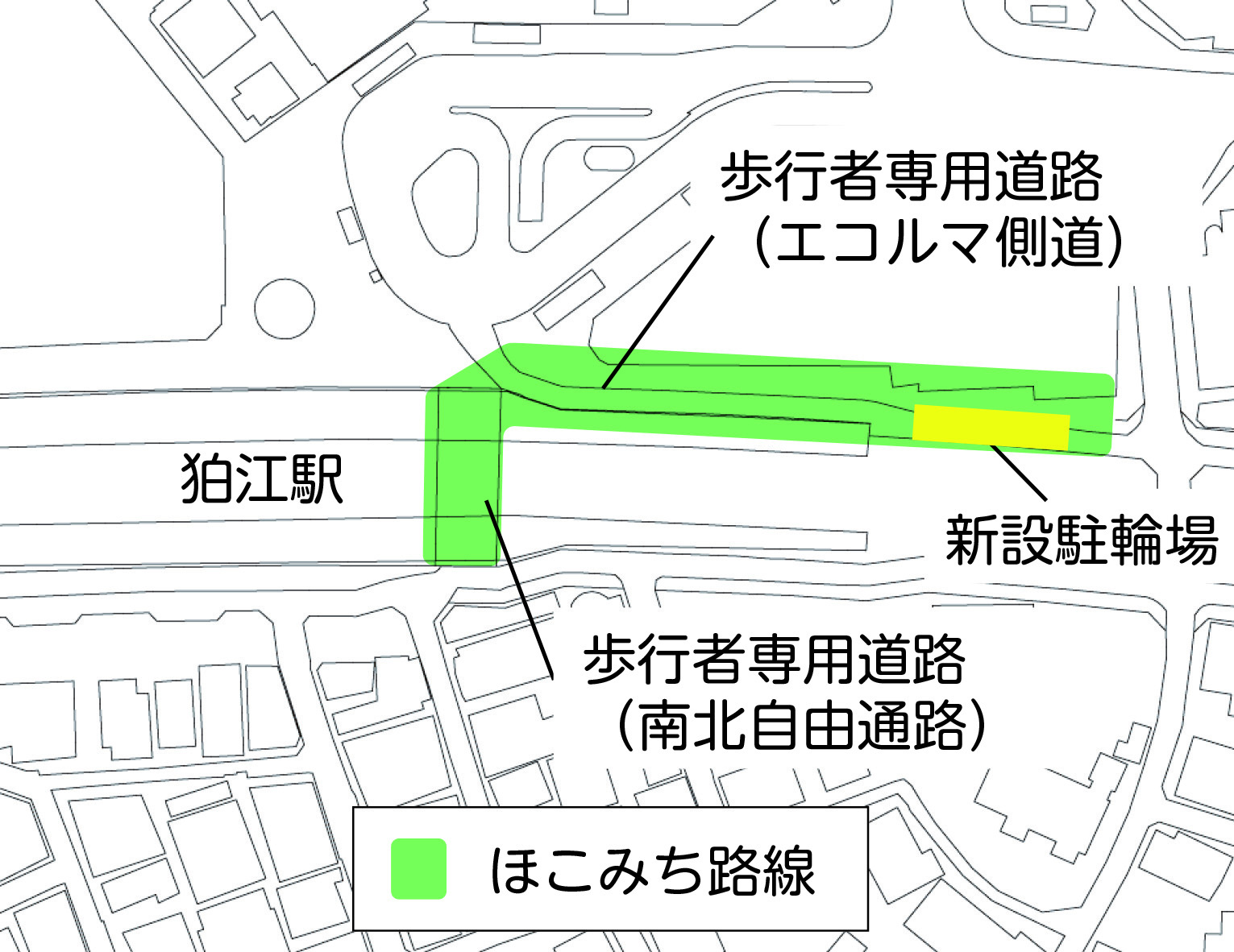 ほこみちの運用を開始する区域は、今回道路改修が終了した狛江駅北口周辺道路のうち、市が利便増進誘導区域として指定した区域です。