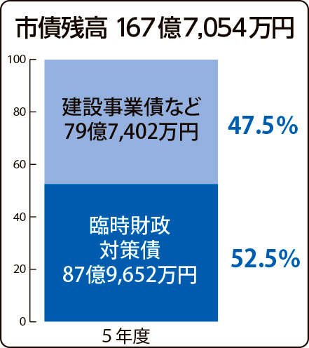 市の借金である市債は、道路、学校等の公共施設を整備するための建設事業債と一般財源の不足を補うための臨時財政対策債があります。