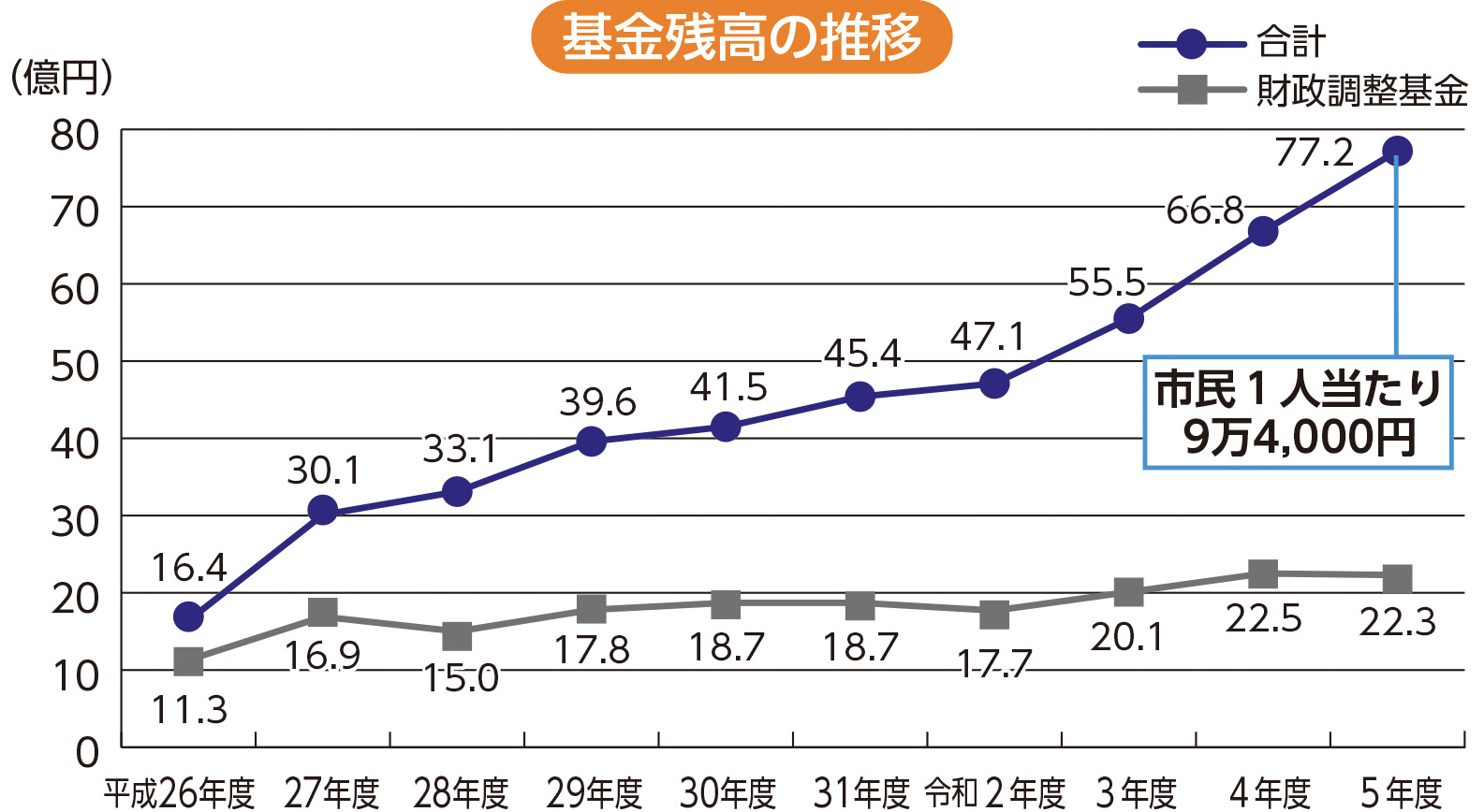 市の貯金としての役割がある基金は、経済状況等に対応するための積み立て分である財政調整基金と、特定の目的のために積み立てている基金があります。