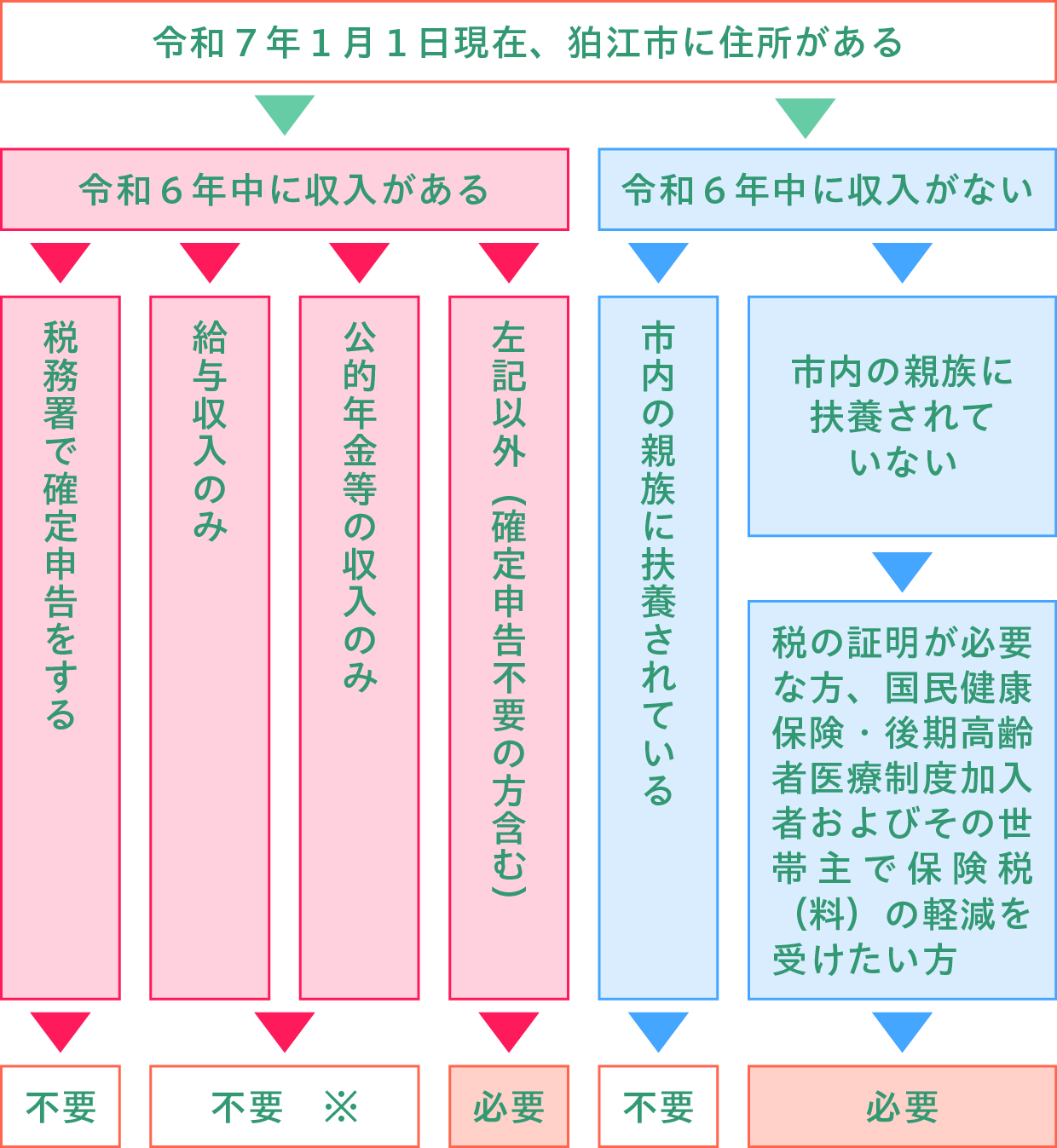 ※給与収入のみで勤務先から給与支払報告書(源泉徴収票)が提出されている場合は申告不要です。ただし、源泉徴収票に記載のない控除を受ける場合は申告が必要です。申告する所得・控除等によって必要な書類が異なるため、詳細は課税課へお問い合わせください。