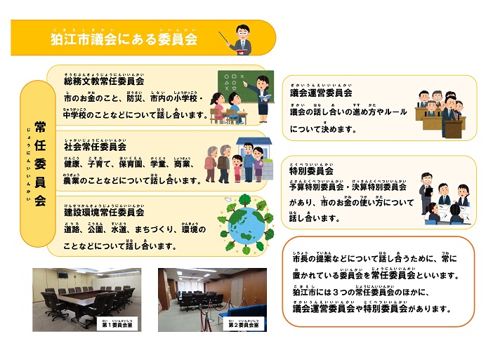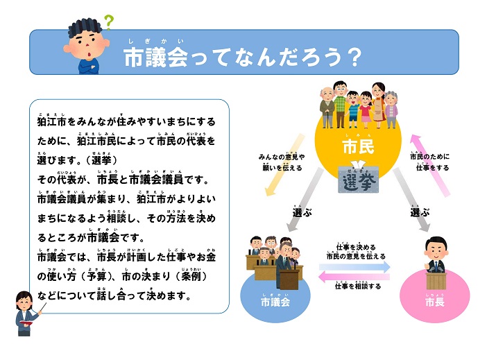 狛江市議会のことをもっと知ってもらうためのページです。市議会は、狛江市をよりよくするために大切な役割をしています。 このページを見て、市議会についていっしょに学び、考えましょう!