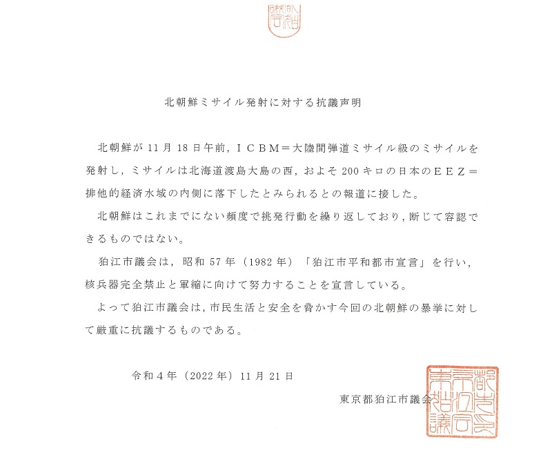 北朝鮮が令和4年11月18日に大陸間弾道ミサイルを発射し、日本の排他的経済水域の内側に落下したみられるとの報道に接し、狛江市議会は抗議声明を発表しました。