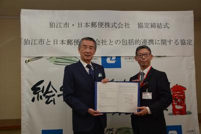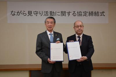 | 定例記者会見の様子 | JCOMとの協定締結式 |