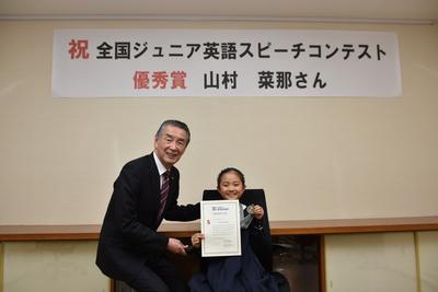 | 全国ジュニア英語スピーチコンテスト優秀者 山村那奈さんとの記念撮影 |