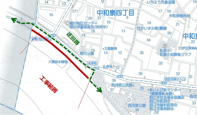 〔工事範囲〕多摩川土手(水神前交差点付近から調布市境付近)